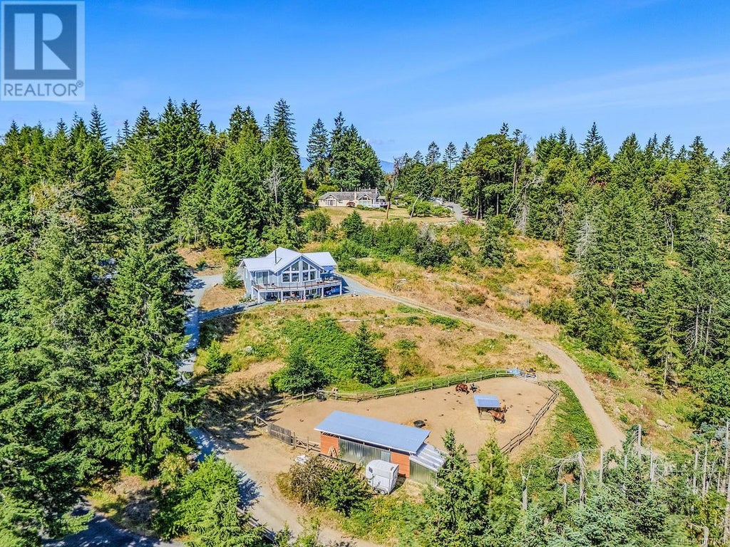 Just off the main paved Morello Road, a steep gravel driveway leads to a jewel of a property including the still like new 4-bed, 3-bath home. Perched on a 5.11-acre hillside property overlooking stunning views of Nanoose Bay, Salish Sea, & the Coastal mountains. The main floor features vaulted ceilings, picture windows, an open living/dining area with a cozy stove, a large kitchen with ample cabinetry, 3 bedrooms including the primary bedroom and 4pce ensuite, a 4pce main bath, laundry room, and a wrap around balcony with multiple seating areas. Downstairs is a bright 1-bed in-law suite with its own kitchen, den, flex room, 3-pce bath, laundry, and walkout patio. Additional features include an electric furnace with heat pump, metal roof, drilled well, septic & the remainder of the builders warranty. Ideal for horse lovers, the large yard includes a flat paddock area with shelter and covered storage. A unique property with incredible potential with great zoning and unforgettable views. (id:36535)