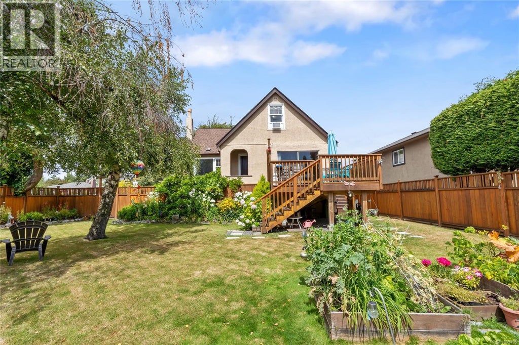 Classic 1932 Oak Bay character home on a sunny corner lot offering timeless charm, great bones, and an expansive, fully fenced south-facing backyard with mature gardens and a newer sun deck for outdoor enjoyment. Situated in one of Oak Bay’s most walkable neighbourhoods, this home presents an increasingly rare opportunity to enter the market at this price point — with plenty of room to build equity through thoughtful updates over time. Inside, the home is move-in ready and features a refreshed kitchen with newer countertops, appliances, flooring, and paint. The layout provides excellent flexibility, with two bedrooms on the main, two more upstairs, and a full basement offering abundant storage, a workshop area, and an integrated garage. Recent improvements include new vinyl plank flooring in the main-floor bedrooms, hallway, and bathroom, new carpet on the stairs, and new vinyl plank flooring upstairs. Character details like coved ceilings, original millwork, and large picture windows preserve the home’s 1930s warmth and personality, while the spacious corner lot—with its broad frontage and sunny exposure—enhances both lifestyle and long-term potential. The property’s configuration makes it particularly well suited for future densification or garden suite potential under Oak Bay zoning (buyer to confirm). Conveniently located just steps from Carnarvon Park, local schools, and the shops and services of Oak Bay Avenue, with direct bus routes to downtown, UVic, and Jubilee Hospital. This is a wonderful chance to establish roots in a highly desirable neighbourhood and build sweat equity in a home that’s comfortable today and holds value for the future. (id:36535)