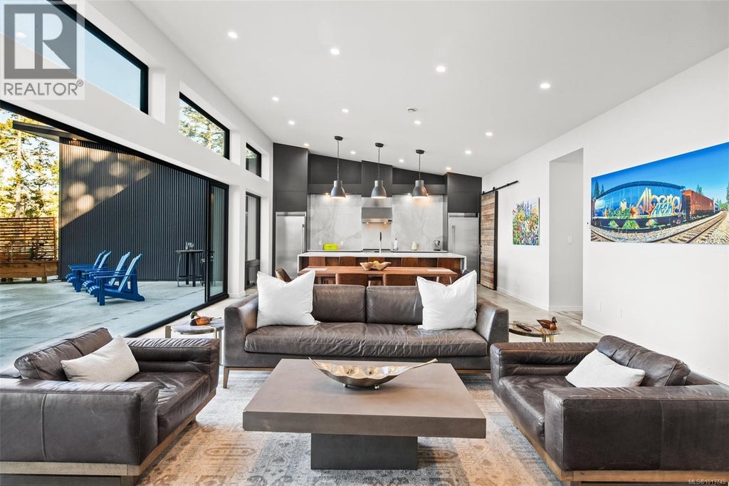 Ready to downsize but not sure about a condo…here is the perfect alternative…ideal for the lock & go lifestyle...the great room w/its wood burning stove in this contemporary OCEANFRONT duplex is the size of most 2 bed condos. The world's stresses & noises dissipate as you drive up the 1000' long driveway to 200+ lineal ft of ocean frontage on Sooke harbour. Being right on the deep water channel means whales & sailboats pass in front of your 600sf patio - prewired for hot tub. 14' ceilings…32' glass wall….all concrete ICF construction w/a 12'' concrete wall clad in 12'' of foam between the 2 units….no noise transfer… luxury appls… massive island…. low utilities… home insurance for less than $1000. Corrugated metal & concrete panel exterior…no maintenance…polished concrete floors w/in-floor heat. No strata fees & existing zoning allows a bunkhouse or AirBnb - potentially generating $40-50k/yr. Note: meander up the driveway & watch for wild peacocks, deer & rabbits…your freeloading tenants (id:36535)