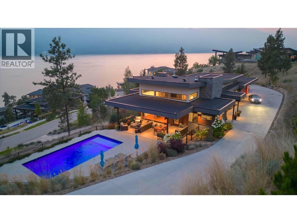 Lakestone Estates awaits! This gorgeous 4+ bedroom 5,100+ sq/ft west-coast contemporary 'lake house' w/ 3+ Car Garage (room for boat) with 0.78 Acre lot on one of the Okanagan's most desirable streets. Open the 15 ft Folding Sliding Door allowing the dining room and kitchen to extend onto your covered deck with fire table area, BBQ space, sun lounging zone, salt water pool, and hot tub. Inside, the 14 ft ceilings and full windows create a serene vista from which to take in a panoramic view of the lake. Retreat to a luxury primary bedroom w/ large walk-in closet and spa-inspired ensuite. Off the contemporary chef's kitchen with 12ft island, is a small office and walk-in pantry housing the extras - ideal for entertaining. Downstairs you will find 3 bedrooms, a chilled wine display, a flex room / second laundry (roughed-in for 4th bath), media room, and large Rec Room / Multi-purpose space with two access doors and direct stairs to garage for convenience. Incredibly well thought out, and meticulously maintained. High end hardwood floors, quartz counters, and custom cabinetry throughout. Multi-zoned heating/cooling and multi-room speakers. An easy stroll to Lakestone’s beach for boating access, kayaking or SUP boarding, tennis and pickle ball courts, and hiking / biking trails. Enjoy sampling wine at one of 7 local wineries. This location and home will not disappoint! View HD Video w aerial drone footage (See Media Link), Virtual Tour, & Floor plans. Low strata fee. Not in HOA. (id:36535)