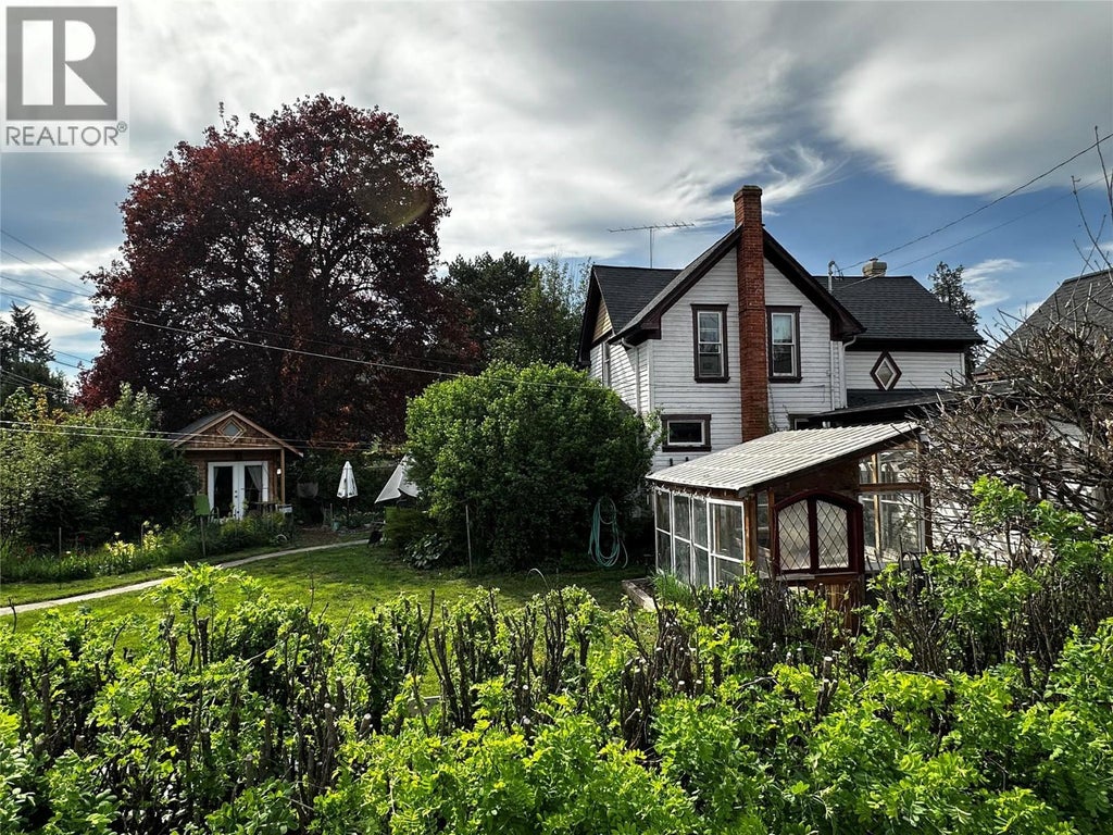 A Beautiful Registered Heritage Home in Armstrong – The Glover House, Built in 1883 is a stunning property that marries vintage character with modern comforts. Surrounded by gardens, fruit and nut trees, this fully fenced and hedged property offers exceptional privacy for relaxing or entertaining, with two covered porches. Inside, original fir floors, antique light fixtures, leaded glass windows, radiant cast iron heaters and restored wood paneling speak to the home’s rich history. The living room fireplace has an electric insert but can potentially be converted back to wood. Upstairs you'll find three bedrooms with 15-pane doors, built-in bookcase, and abundant natural light. A fourth room off the kitchen serves as an additional bedroom or office. Two full bathrooms, with the upstairs bath features a clawfoot tub. The central kitchen blends old and new with modern cabinetry, a porcelain farmhouse sink, gas stove, and a functional wood-burning stove. Enjoy outdoors with an 8-person hot tub under a gazebo and alongside you will find a sheltered fire pit area. A detached studio beneath a grand Norwegian Maple offers extra space for guests. The carriage house provides covered parking, an upper-level storage loft, and an attached workshop. A separate greenhouse awaits garden enthusiasts. Updated electrical, plumbing, and a WETT-certified wood stove, the Glover House has systems in working order, a rare opportunity to own a beautifully preserved piece of Armstrong’s history. (id:36535)