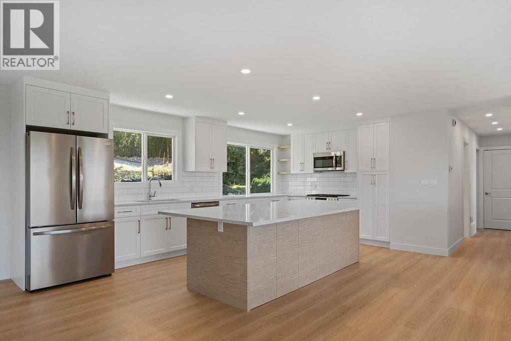 The perfect blend of rural charm & urban convenience! Set on a manicured 1/4 acre lot on the Rutland Bench w/ only 4 homes on the street, this beautifully updated property fronts onto a cherry orchard & boasts expansive valley & lake views-offering rural serenity yet just minutes to shopping, schools, YLW, UBCO + only 20 min to Waterfront Park downtown & 40 min to Big White! At the heart of the home is a chef-inspired kitchen featuring custom cabinetry, quartz counters, SS appliances, gas range & massive 10x5 island w/ storage that's perfectly setup for entertaining. The bright, open main level seamlessly connects kitchen, dining & living areas, where you’ll enjoy Okanagan sunsets every single evening while cozying up & relaxing by the WETT-certified wood-burning fireplace. French doors lead to the enclosed bonus sunroom & deck access for year-round enjoyment. Main level also features 3 bedrooms including the primary w/ beautiful new 3-pc ensuite + new full 4-pc bath. The walk-out lower level adds incredible versatility w/ a 1-bedroom in-law suite complete w/ kitchen & spacious rec room—perfect for extended family & guests. Move-in ready w/ peace of mind including new roof, furnace, A/C, HWT, updated elec/plumbing & newer windows throughout. Outside: 6-zone irrigation, tiered garden, peach tree & 2 cherry trees + Plenty of parking & attached garage w/ 30A EV plug. If you're looking for the perfect family home in a choice location, this may be the one you've been waiting for! (id:36535)