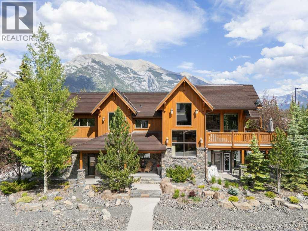 Welcome to this stunning custom mountain home, tucked away on a very private street in one of Canmore’s premium and most sought-after locations. Panoramic views from the Three Sisters to the Rundle Range fill the open-concept upper level through dramatic raked windows. A striking Rundle stone fireplace anchors the spacious living and dining areas, while the chef’s kitchen impresses with Wolf, Sub-Zero, and Miele appliances, granite counters, and an island bar. Step onto the wraparound deck for all-day sun and mountain vistas. The vaulted primary suite features its own view deck and spa-inspired 5-piece ensuite with steam shower and jetted tub. A second bedroom with ensuite, laundry, and powder room complete this level. The walkout lower level offers in-slab heat, a large family room with fireplace, two bedrooms, a 5-piece bath, and an office with custom built-ins. Finished with low-maintenance landscaping and extensive Rundle stone, plus an oversized, heated garage. (id:36535)