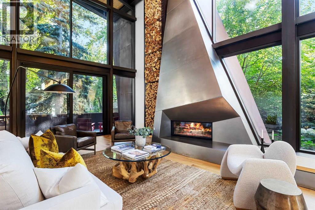 Welcome to Montreal House, an award-winning landmark residence in Calgary’s historic Mount Royal, designed by renowned architect Jeremy Sturgess. This home isn’t just built — it’s imagined for connection, light, and lasting impact. Tucked away on a quiet, tree-lined street, this 5-bedroom residence spans 4,000 sq. ft. above grade, with over 5,700 sq. ft. of total living space and a triple garage, combining bold design with livable family comfort.From the street, its sleek linear form opens to a private west-facing yard framed by mature trees. Inside, soaring double-height ceilings and open living spaces create a natural flow for gathering, while east-facing bedrooms greet the morning sun.The exterior blends Corten steel and Kayu Batu wood, materials chosen to weather and evolve beautifully over time. A 25-foot sculptural steel fireplace bridges indoors and out, while 18 cantilevered glulam beams shade the glass walls and frame the western garden.Upstairs, the cantilevered primary suite floats into the treetops, complete with a roof terrace overlooking the city skyline. Every angle has been designed with purpose — balancing privacy, sunlight, and seamless transitions from indoors to outdoors.The lower level offers a glassed-in wine cellar, guest suite, wet bar, and custom storage for an art collection.Internationally recognized, Montreal House has been a finalist at the World Architecture Festival and honoured with national design awards. It’s more than a home; it’s a place where art, architecture, nature, and everyday living come together. (id:36535)