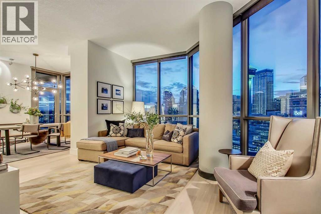 This renovated sub-penthouse at Keynote One delivers. Towering above the city, executive living showcases panoramic views of the Rocky Mountains and glittering downtown skyline.This address isn’t just central—it’s strategic. With the highly anticipated Calgary Ice District on the horizon, you’re not only investing in a luxury home, you’re investing in the city’s future. Positioned steps from the Saddledome and Stampede Park, this location is set to become the beating heart of Calgary’s sports, entertainment, and culture scene—a world-class hub that will elevate property values and prestige for years to come.The WOW starts at the front entry when you are struck by the 10-foot ceilings and floor-to-ceiling windows with massive spans of glass - the views command attention. Herringbone floors flow through a sleek layout with 2 bedrooms, 2 bathrooms, and a versatile den. The nearly 20-foot balcony offers front-row seats to mountain sunsets and city lights, perfect for entertaining or unwinding.The chef’s kitchen is bold and functional, with Café appliances, bronze hardware, quartz waterfall counters, and a walk-in pantry upgraded with custom California Closets shelving.Perched at the edge of the building, the primary suite is a sanctuary of privacy and calm. Encased in concrete with no neighbours on either side, it offers unrivalled quiet. Imagine sinking into bed, the fireplace glowing beside you, as the lights of the Calgary Tower twinkle in the distance—a nightly view reserved only for the few at the top. The ensuite is clad in rich limestone with a private water closet, and the custom walk-in closet—designed by California Closets—provides the organization and polish you’d expect at this level. More than four walls—it comes with a lifestyle amenities including Sunterra Market and Market Bar at your doorstep, a professional fitness center and cardio room, guest suites for visitors, and direct access to the +15 network, river pathways, and the city’s expanding core . One Titled "Rock-Star" parking stall and storage locker came come with this purchase and additional parking is available for rent. (id:36535)