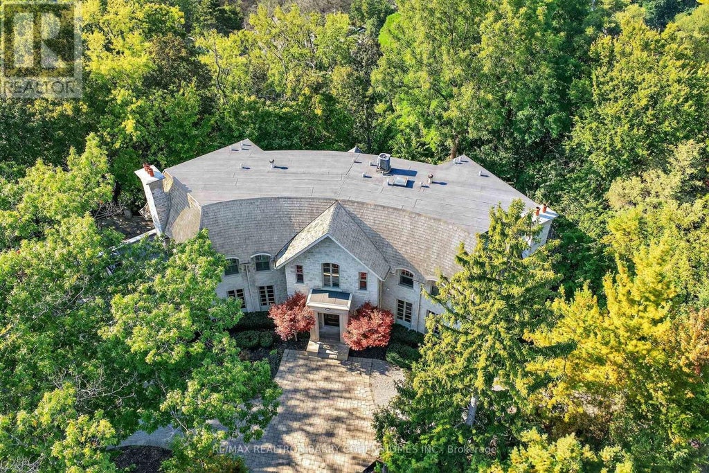 Backs Onto Ravine! Perched gracefully at the highest point of Hoggs Hollow, this French Château inspired masterpiece sits on a spectacular 239.08 x 207.81 ft ravine lot (approx. 1.14 acres). Designed by Dee Dee Taylor Hannah and built by award-winning builder Michael Rossini, this timeless stone estate offers over 10,000 sq.ft. of luxurious living space, blending European elegance with modern comfort. The homes distinctive curved and symmetrical design showcases architectural artistry rarely seen today. Featuring 4 bedrooms with ensuites, 9 washrooms, and a 3-car garage with a circular driveway accommodating up to 15 cars, all principal rooms face west, overlooking the serene ravine. A grand marble foyer, curved hallways, and custom millwork opens to elegant living and dining rooms that walk out to the ravine and garden. Two libraries on main floor, five fireplaces, built-in speakers, 10-ft ceilings, and hardwood floors throughout. The gourmet kitchen with double granite islands and an open-concept family room with motorized curtains creates a warm and inviting space for entertaining.Step out to a 700 sq.ft. patio with outdoor fireplace and panoramic ravine views. The primary suite features a lavish 7-piece ensuite, his & her walk-in closets, and heated bathroom floors. The walk-out lower level wth heated floors includes a home theatre, wine cellar, sauna, wet bar, nanny/guest ensuite, and a recreation room with fireplace opening directly to the backyard oasis.The heated concrete pool with cascading waterfall, framed by mature trees, creates a private, resort-like retreat. A rare offering combining elegance, privacy, and tranquility, just moments from the Granite Club, top private schools (Crescent, TFS, Havergal, UCC, BSS), fine dining, and Rosedale & Don Valley Golf Clubs.A true statement of taste, craftsmanship, and enduring luxury in one of Torontos most prestigious enclaves. (id:36535)