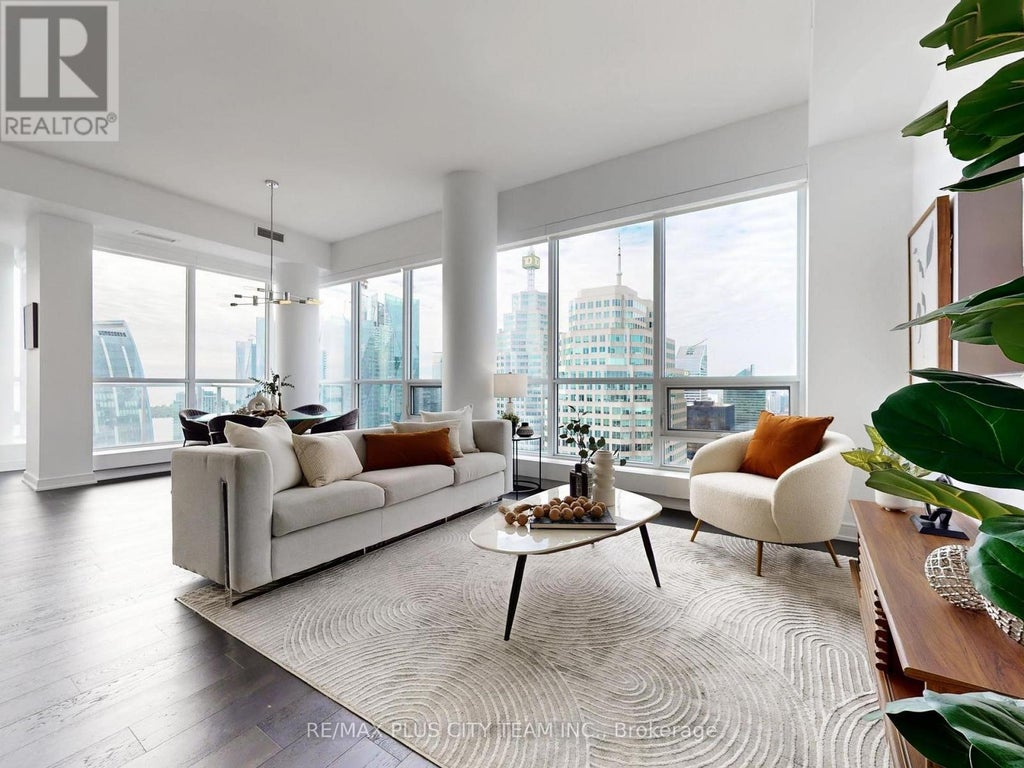 When you imagine life in downtown Toronto, this is the address that captures it all! Located at 88 Scott Street, this elegant residence puts you right where you want to be, steps from the Financial District, St. Lawrence Market, Berczy Park, the PATH system & the Waterfront. With over 1,600 sq ft of living space and featuring 10-foot ceilings throughout, this expansive 2 bedroom plus enclosed den unit blends style, comfort, and functionality. Floor-to-ceiling windows flood the open-concept living and dining areas with natural light, showcasing panoramic views of both the city skyline and the lake. Situated on an exclusive floor with only four suites, this home provides a sense of privacy rarely found in downtown living. The sleek, modern kitchen features integrated appliances, a large centre island, and seamless sightlines perfect for entertaining or unwinding at the end of the day. The expansive primary bedroom offers tranquil lake views, a generous walk-in closet and double closet, and a spa-like ensuite featuring two sinks, a stand-up shower, and a soaker tub. The second bedroom also features its own ensuite with two sinks and a stand-up shower, and impressive city views. What was an open concept den has now been fully enclosed and provides the versatility of a spacious third bedroom or private home office with lots of natural light. Additional features include a stylish powder room, a hallway storage closet, and in-suite laundry for added convenience. Includes a convenient parking spot with direct access to your own private locker room. Residents of 88 Scott enjoy a full suite of upscale amenities, including a fully equipped fitness centre, indoor pool, sauna, party room, billiards room, and Theatre Room on the 6th floor. An amazing Sky lounge on the 46th and 47th floors. A warm and welcoming 24-hour concierge offers exceptional service and peace of mind, making you feel at home from the moment you arrive. (id:36535)