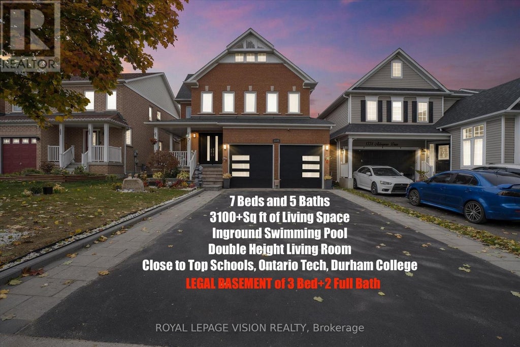 Bring your OFFER ANYTIME to make this house your HOME! Experience over 3,100 sq.ft. of elegant living space in this fully brick, two-storey home located in the highly sought-after Taunton community of North Oshawa. Offering a total of 7 bedrooms and 5 bathrooms, this property is designed to accommodate large or multi-generational families with ease. Enjoy parking for six vehicles, including a double-car garage, and make the most of your summers with a heated inground swimming pool - perfect for family fun and entertaining guests. The main level welcomes you with bright, spacious principal rooms that balance comfort and style. The impressive living room features towering double-height ceilings and expansive windows, filling the space with natural light. A formal dining area with a tray ceiling and pot lights sets an inviting tone for gatherings, while the family room, anchored by cozy gas fireplace, offers a relaxed atmosphere for everyday living. The modern chef's kitchen, complete with ample cabinetry, a large center island, custom backsplash, and a breakfast area that opens onto a deck overlooking the backyard retreat, is sure to fall in love with! Upstairs, the primary suite provides a private sanctuary with a sitting area, a walk-in closet fitted with organizers, and a spa-inspired 4-piece ensuite. Each additional bedroom is generously sized and includes custom closets, ensuring both comfort and functionality. The LEGAL walk-up BASEMENT serves as a fully equipped secondary living space with its own covered entrance, multiple bedrooms, bathrooms, and large living areas - ideal for extended family or generating RENTAL INCOME. Perfectly blending space, sophistication, and flexibility, this home is just minutes from top-rated schools, Durham College, Ontario Tech, parks, shopping, transit, and Hwy 407 access. A truly exceptional property ready to suit your lifestyle needs. (id:36535)
