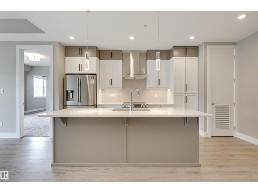 TOP FLOOR UPGRADED LUXURY! This stunning 2 bed, 2 bath + den condo in sought-after Griesbach delivers over 1,300 sq. ft. of refined living with 10 ft. ceilings & premium upgrades throughout. The kitchen showcases quartz countertops, a 4-seat island, full-height two-tone cabinetry, designer tile backsplash, stainless steel appliances, & a custom beverage centre with extra cabinetry. The open-concept living room features east-facing windows with motorized blinds, upgraded vinyl plank flooring, & access to the private patio. The spacious primary bedroom offers a walk-through closet with custom built-ins & a beautiful ensuite. A versatile bonus room is ideal for an office, nursery, or gym. The second bedroom is paired with a sleek 4-piece bath. Additional upgrades include a full laundry room with custom cabinetry, TWO underground parking stalls, and extra storage. Veritas residents enjoy premium amenities: fitness centre, guest suite, social room, & A/C. All just steps from shops, cafes & future LRT. (id:36535)