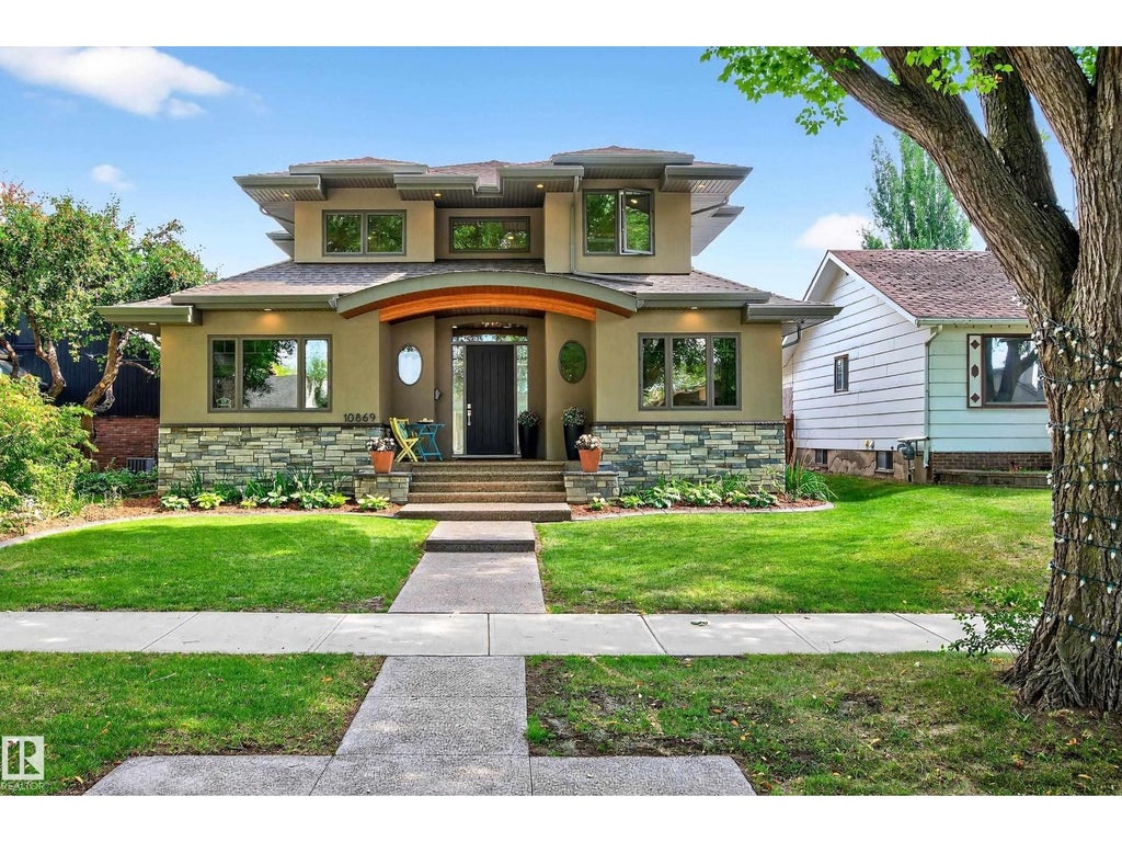 NOT a COOKIE CUTTER Outstanding executive custom home 3 houses away from ADA Blvd and river valley. Quality shines thru the 3900 sq ft of living space. Outstanding curb appeal with curved entrance roof, acrylic stucco & fantastic landscaping. Enter the spacious foyer and great room focused filled with natural light & view of yard. Custom chef kitchen, pantry, quartz countertops, gorgeous fireplace wall . Heated Porcelain tile floors, Walls of windows, main floor den/bedroom, office& access to outdoors. Bathroom , laundry, dog washing station, complete this level. Generous stairs to the massive primary suite, walk in closet, laundry room, spa ensuite, and a library or second closet or nursery space. Lower level even has a secret door! Bar area, media room, games area, exercise room or 4th bedroom, bathroom and loads of finished storage. Projection theatre equip/screen. Back garden is stunning. Aggregate concrete decks/patios, 3 car garage, professional landscaping. Discerning buyers may apply. (id:36535)