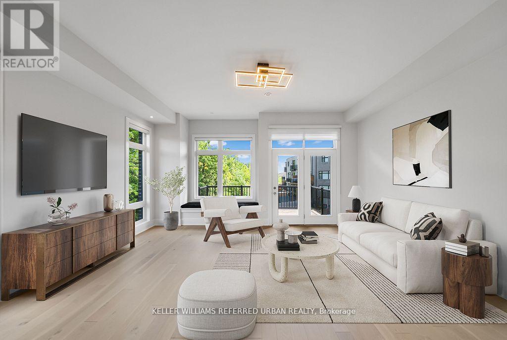 **INCLUDES INCOME GENERATING TWO STOREY BASEMENT APARTMENT ** The Designers Own Dream Home in Patterson. Set on a rare 33' ravine lot with a walk-out basement and an extra-wide 21 interior, this end-unit townhome is unlike anything else in Patterson. The two-storey basement apartment, complete with laundry, offers versatility perfect for multi-generational living or as a rental suite generating approximately $2,700/month. Envisioned by a renowned interior designer, every detail has been thoughtfully curated to surpass model home standards. Step inside to soaring 10 ceilings on the main floor and 9 on the second, smooth ceilings throughout, and rich 5" hardwood paired with 7" modern baseboards and shaker doors. The kitchen is a true showpiece, anchored by a 10' island with dual waterfall edges, quartz counters, walk-in pantry, under-cabinet lighting, and a window seat that captures ravine views.The primary suite offers a retreat-like feel with a custom walk-in closet and spa ensuite featuring a standalone tub, quartz niches, sleek skirted one-piece toilets, and upgraded fixtures. Outdoors, professional landscaping, interlock walkways, private side patio with backyard access, extended deck, multiple patios, and vinyl fencing create a private oasis. Added conveniences include dual laundry rooms, CAT5 wiring, BBQ gas line, and extra parking.This is more than a home it's a statement of style, function, and luxury living. *Note photos are virtually staged. (id:36535)