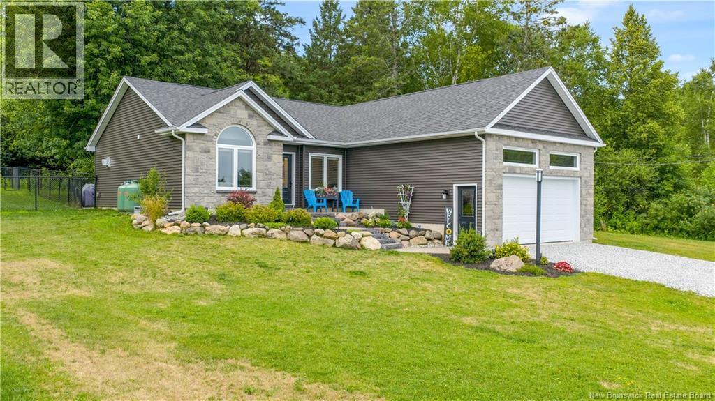 Easy one Level Living in new 3 year old Home on 3 Acres in Hampton with an awesome view of the Kennebecasis River Valley. It does not get much better then this Home. Home has a great fenced in yard with 2 separate fenced in areas for your Children & Dogs. This Home is a very nice open concept with the living room flowing into the kitchen with cathedral ceilings flowing along and crown mouldings on the top of the cabinets, roll outs in the pantry, Quartz countertops & a lovely ceramic back splash above the countertops. Off the kitchen we have a deck area to enjoy your special back yard. The deck has a roof over it. From the kitchen you enter the dining area which then flows into the Family/Den which is accented with a beautiful propane Fireplace to relax at. To the left of the Family room we have a hallway that takes us to the main bathroom & then on to the second bedroom. Between the kitchen & living room we enter the hallway that takes us to the Primary bedroom with ensuite & walk in closet. When we go down the spacius hallway to the right we have the Utility/laundry room & the attached Garage. This Home comes with many great features like glass doors on the showers, infloor heat in both bathrooms, central air & heat, generator panel for any power outages & a island with bartop in the kitchen. We are only about 25 to 30 minutes from Saint John & Sussex. There are many activities to do, swim, golf, fish, Curl, boat, hunting is minutes away or relax & enjoy the views. (id:36535)