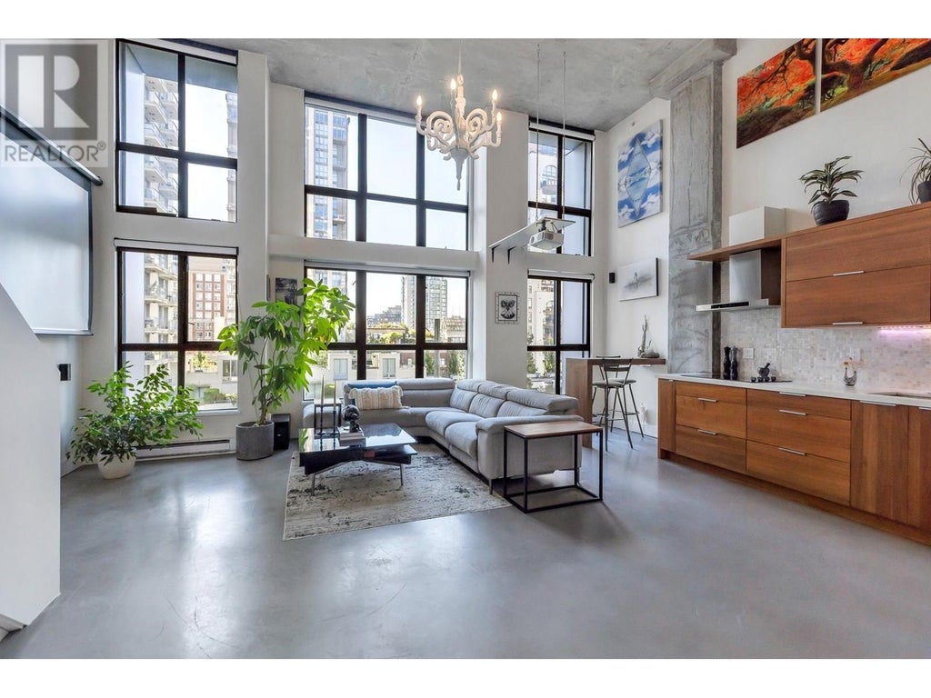 One of One opportunity at The Space Lofts. This floorplan is UNIQUE TO THE BUILDING! Fully renovated with warmth and character, this floorplan offers a 2-bedroom layout and a large kitchen. Dramatic double-height ceilings, polished concrete floors, and exposed concrete feature walls retain the loft's drama while the kitchen warms the space with walnut cabinetry, stone counters, mosaic backsplash, and full-sized appliances. Plenty of natural light from the triple window bank and South exposure. In-suite combined washer/dryer. 1 parking, 2 pets ok. (id:36535)