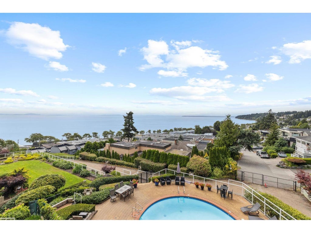 Welcome to Victoria Terrace by Bosa-your seaside retreat in the heart of White Rock! Perfectly positioned in one of the area's most coveted locations, this 2 Bed + Den, 2 Bath home offers completely unobstructed, panoramic views from your 2 balconies of the ocean, pier & Gulf Islands from every room. Thoughtfully renovated, the kitchen dazzles with sleek cabinetry, quartz counters & stainless steel appliances, while both bathrooms have been beautifully updated with modern finishes. Resort-style living awaits with a sparkling outdoor pool & hot tub overlooking the ocean. Just steps to the promenade, beach, cafés & restaurants, this home truly embodies the White Rock lifestyle. In a well-managed, 55+ community that welcomes pets, Victoria Terrace blends luxury, comfort & tranquility. (id:36535)