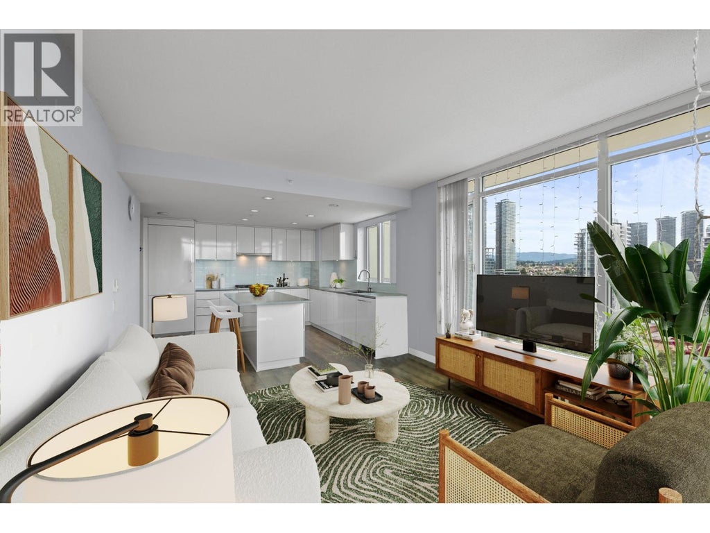 Fulton House by Polygon. Unit 1701 is a bright SE corner 2-bed, 2-bath home with two view balconies. Window over the kitchen sink frames the skyline as you cook. Floor-to-ceiling windows, 9 ft ceilings and laminate floors keep it open and light. Bedrooms sit side-by-side off the living area, ideal for young families. Kitchen has gas cooktop, built-in fridge and quartz island. Full-size side-by-side laundry in its own closet. Enjoy clear city and mountain views from every room. Residents share the 28,000 square ft Fulton Club, pool, hot tub, sauna, gym, yoga, lounge, guest suite and kids play area.Walk to Brentwood Mall, SkyTrain, Whole Foods and cafés. (id:36535)
