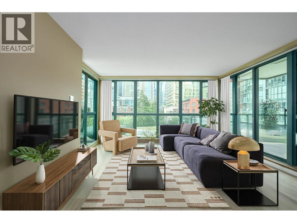 Welcome to this tastefully updated 1 bed+den SW corner unit at Point Claire in the heart of beautiful Coal Harbour. Spanning 792sf, this home offers a functional layout that seamlessly blends living and dining areas with a large adjoining den, ideal as a home office or second bedroom. Floor-to-ceiling windows fill the space with natural light and frame views of the private courtyard, city skyline, and glimpses of the ocean and mountains beyond. Enjoy resort-style amenities including indoor pool, hot tub, sauna, gym, concierge, EV chargers, etc. A rare opportunity to have it all in an unbeatable location! (id:36535)