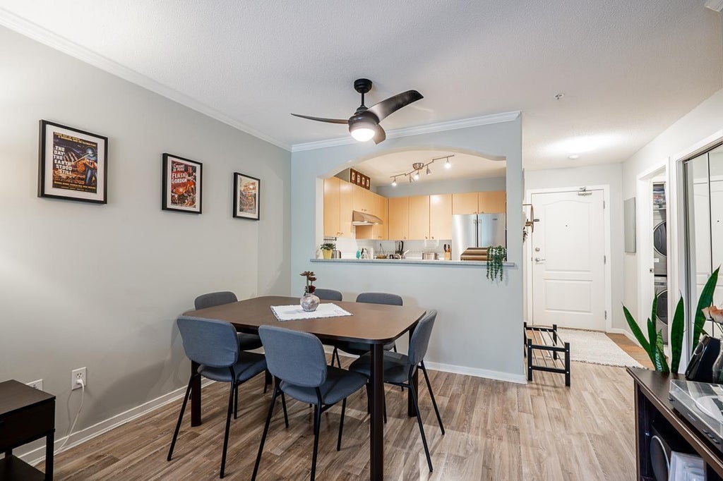 "MURRAY GREEN" This beautifully maintained and tastefully updated 2 Bdrm, 1 Bath home is located in the heart of Murrayville! Enjoy modern touches throughout, including updated laminate flooring, elegant crown moulding, brand-new S/S kitchen appliances, and a full-size washer & dryer. The bathroom has been refreshed with new tile flooring and a stylish vanity. Step out onto the spacious 149 sqft balcony, perfect for relaxing or entertaining while overlooking private greenery. The building offers fantastic amenities, including a guest suite, exercise room, and amenity room! Close to restaurants, coffee shops, grocery stores, W.C. Blair Rec Centre, the hospital, and nearby parks. Parking stall is the closest to the lobby door! 1 locker is also included! (id:36535)