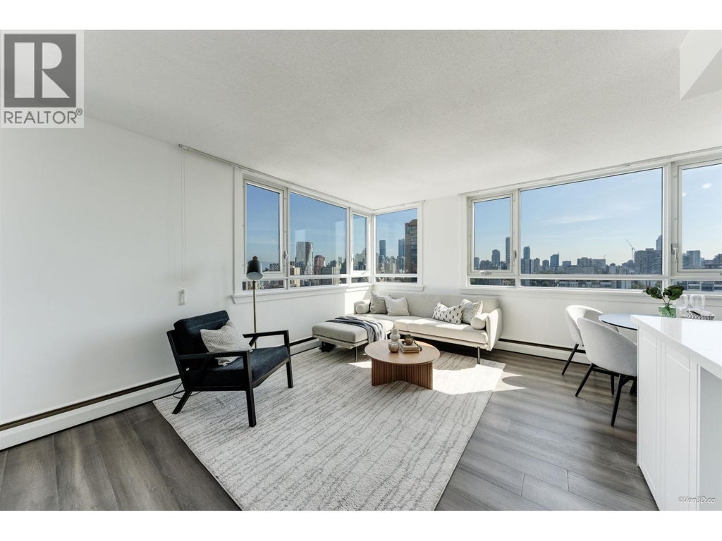 Unbeatable English Bay location and value West of Denman. Upper corner unit with stunning views. Completely newly custom renovated. Some fine details include quartz counters, S/S appliances, engineered wood flooring, custom cabinetry, fixtures and lighting. Bright open floor plan with updated wraparound windows and good size balcony. Resort living at its best in this extremely well looked after building. Enjoy the heated indoor pool, gym, and 360 degree views from the rooftop lounge. Recent pool roof and newly re-piped. Steps to the Beach, Stanley Park, recreation and a variety of shops and restaurants. Parking & storage included. No pets but rentals allowed. Heat, hot water, taxes and onsite caretaker all included in monthly fees. Come enjoy the very best of city/seaside living. OPEN HOUSE, Saturday Nov 8, 1-3pm. (id:36535)