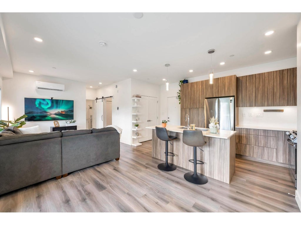 Stunning Condo with an Unbelievable Patio! This 2 bedroom + den, 2 bathroom home truly has it all. The den includes a closet and can easily be a third bedroom. Step into a bright, open layout featuring a beautiful kitchen with nearly 9 ft ceilings. Enjoy top-notch amenities including a gym, clubhouse, playground, and dedicated workspaces-perfect for working from home. Stay comfortable year-round with the much-needed AC unit, and take advantage of the strata-covered gas stove plus gas hookup on the patio. The showstopper is the expansive 668 sq ft patio-ideal for entertaining, relaxing, or giving your kids and pets space to play. Located in a fantastic neighborhood close to schools, parks, shops, the Carvolth bus loop, and more. You won't be disappointed-this is condo living at its finest! (id:36535)