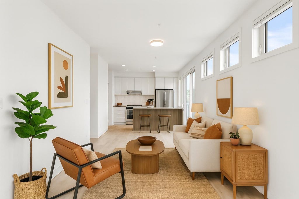Light-filled and stylish, this Scandinavian-inspired corner condo pairs contemporary design with a prime location. Wide-plank floors and large windows flood the space with natural light, while a Juliette balcony adds fresh air. The kitchen shines with Fisher & Paykel + Whirlpool appliances, quartz counters, and an eating bar. Enjoy in-suite laundry, a versatile pantry/closet, spacious entry, and a quality primary closet organizer. COURT WEST allows 2 pets and offers a massive courtyard with movie nights, shared EV chargers, secure bike room, 1 parking stall, and a large locker-steps to Seven Oaks Mall, Superstore, Trading Post Brewing, Cora's, transit, and minutes to Mill Lake Park. QUICK COMPLETION POSSIBLE (id:36535)