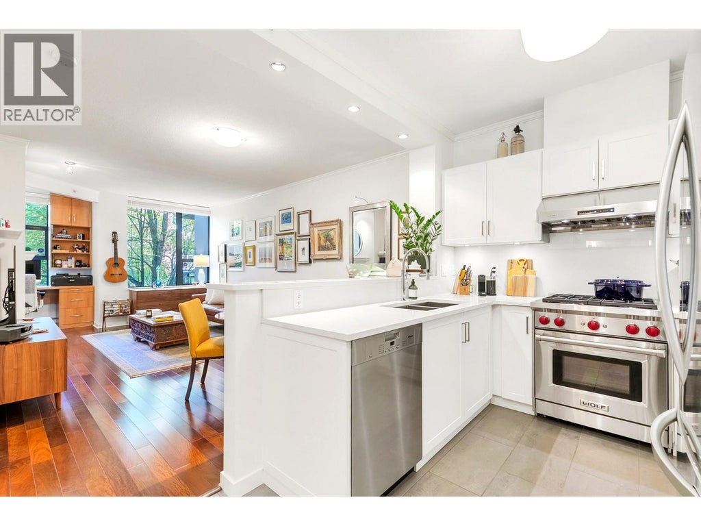 TROPEZ... Beautiful award winning rainscreened CONCRETE building in wonderful Arbutus Walk neighborhood. Fantastic one bedroom suite with sought-after exposure overlooking Arbutus Walk greenway. Beautifully renovated & maintained with quartz countertops and backsplash, custom pantry, updated cabinets doors, walnut engineered flooring in living/ dining room, custom built-in office desk & shelving. Super floor plan with extra LARGE bedroom, OFFICE alcove, open kitchen & balcony. Parks, Kitsilano Community Centre, Arbutus Greenway, restaurants & cafes just steps away. Close (but not too close) to upcoming Arbutus Skytrain Station. Showings by appointment. Call your agent today. (id:36535)