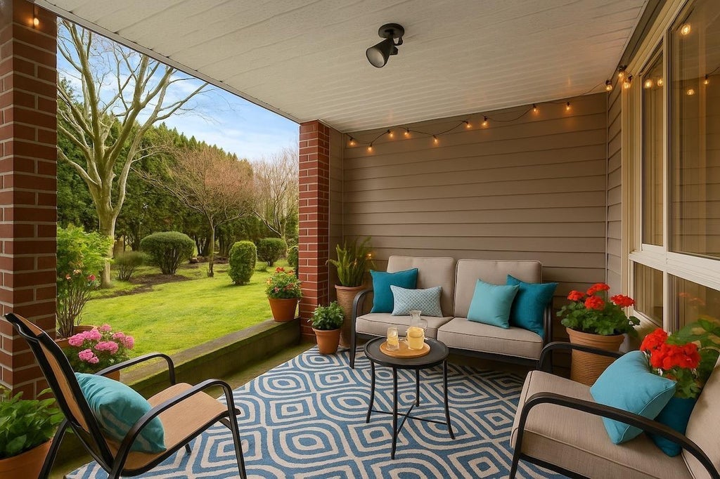 Enjoy tranquil GREEN SPACE VIEWS from this private ground-floor condo in coveted Muirfield Gardens! Move-in ready 2 bed+large den(or 3rd bdrm!) on QUIET SIDE of complex - not facing 152nd! Functional layout with no wasted space & luxury vinyl plank flooring throughout. Open kitchen boasts ample cabinet space, stone counters, breakfast bar & updated appliances. Spacious living/dining area with cozy gas fireplace (gas incl. in MF) opens to a fully covered patio-perfect for pets or entertaining! Bedrooms sit on opposite sides for privacy; primary has walk-in closet & ensuite. Large den is perfect for a home office or 3rd bdrm. Includes 1 parking (option to rent 2nd) & locker. Proactive strata with new depreciation report, roof (2024), & great amenities incl. guest suite & gym. Only steps to transit, shops & dining! Quick possession possible. (id:36535)