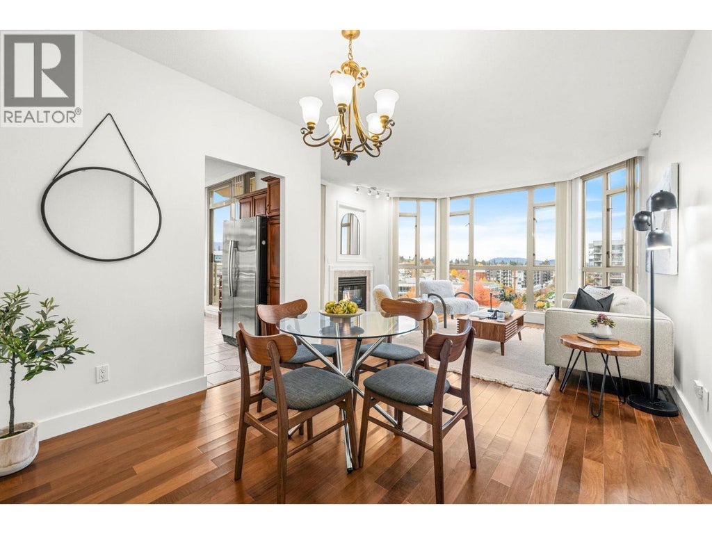 You´ll love this incredible corner suite at Victoria Park West with breathtaking 240° views from the North Shore Mountains to Burrard Inlet, Downtown Vancouver, and Mt Baker - a panorama that glows with sunrise light and sparkles at night. Set in a sought after concrete building beside beautiful Victoria Park, this bright and inviting 2 bedroom, 2 bathroom home features 9´ ceilings, floor to ceiling windows, and hardwood floors throughout the main living areas. The expansive layout easily accommodates full sized furniture, offering the perfect transition for those downsizing or seeking more space. The kitchen is soaked with natural light & features granite countertops and a cozy eat-in nook, while the spacious living and dining areas enjoy a gas fireplace and open to a covered balcony - perfect for morning coffee or sunset views. Freshly painted and move in ready, with access to a fitness centre, hot tub, sauna, guest suites, and lush gardens. Steps to shops, restaurants, the Shipyards, and the SeaBus. (id:36535)