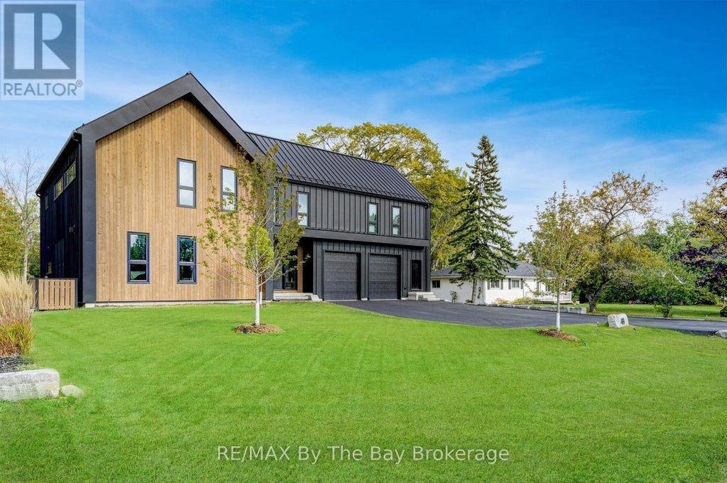 Welcome to a masterpiece of modern design and meticulous craftsmanship. This luxurious Scandinavian-style residence, nestled on a generous 90ft by 200ft lot in Collingwood offers an unparalleled blend of elegance and functionality. The home's striking exterior features a sophisticated fusion of Scandinavian Spruce wood siding and 24-gauge standing seam steel siding and roof, crowned with a 50-year warranty. Step through the grand 40" front door into an impressively crafted entrance with heated floors. A well-appointed main floor laundry room, with Whirlpool appliances. The open-concept living, dining, and kitchen area exudes luxury with its 7.5" Muskoka Custom Finishing hardwood floors, a Napoleon fireplace, and a dramatic dark tile feature wall. The chef's kitchen is a culinary haven, showcasing high-end KitchenAid smart appliances and a Moen touch-less, WiFi-capable faucet. Adjacent to the kitchen, an office with pocket doors and access to the rear covered deck. The custom staircase by Stairhaus Inc. makes a stunning architectural statement, guiding you to the upper level. Here, a spacious family room complements 3 beautifully appointed bedrooms. The primary suite is a luxurious sanctuary, featuring a walk-in closet and a 6pc private ensuite, plus a walkout to a covered Duradek waterproof deck. A 4pc semi-ensuite bathroom and a thoughtfully designed 2pc bathroom on the main floor cater to both privacy and convenience. Above the garage, a legal second-dwelling apartment presents an excellent opportunity for additional income or guest accommodation. With its own private entrance, this charming apartment features an open-concept living, dining, and kitchen area with Frigidaire appliances, a stackable washer and dryer, a cozy bedroom, and a stylish 3pc bathroom. A set of 9ft x 10ft garage doors with drive-through provides an ample amount of garage and storage needs. This custom-built Scandinavian-style home stands as a testament to superior quality and refined livin (id:36535)