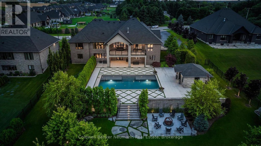 Nestled on a pristine 3/4 acre lot in the coveted Swan Creek Estates community, this exquisite all-stone bungalow redefines luxury living. With over 5,000 sq ft of masterfully crafted space, every detail of this ENERGY STAR certified residence speaks to sophistication and comfort. From the moment you enter through handcrafted Canadian mahogany doors, you're enveloped in architectural grandeur vaulted ceilings, 8' doors, and expansive windows that bathe the interiors in natural light. The open-concept design flows seamlessly through curated living spaces, featuring custom millwork, a sleek linear fireplace, and heated polished concrete floors on the lower level. The gourmet kitchen is a culinary showpiece, complete with integrated high-end appliances, bespoke cabinetry, a generous prep island, and a butlers pantry designed for effortless entertaining. Five bedrooms and four spa-inspired bathrooms including a serene primary ensuite with in-floor heating offer a retreat-like ambiance throughout. Step outside to discover a private oasis. The resort-style grounds showcase award-winning landscaping, a custom year-round pool with tanning ledges and ambient lighting, a charming Muskoka playset, and a built-in fire pit perfect for twilight gatherings. A cedar-lined pool house with private change rooms and an outdoor shower adds a touch of rustic luxury. This is more than a home its a lifestyle of elegance, comfort, and connection to nature. Schedule your private showing today and experience it for yourself. (id:36535)