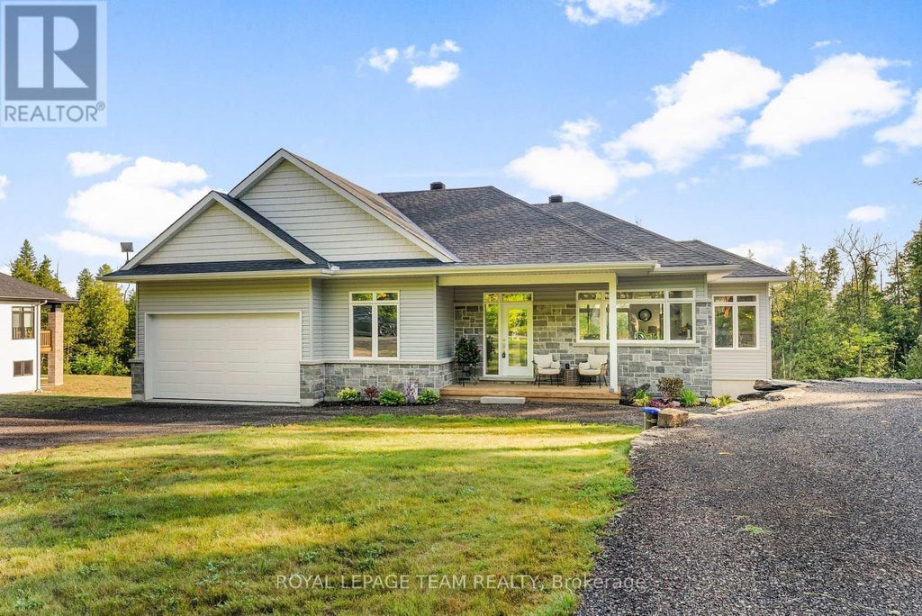Located in the desirable community of Calabogie, just steps from the Calabogie Highlands Golf Course and a short drive to the Calabogie Motorsports Park, this home is a car enthusiast's dream! This immaculate 3 bed, 2 bath bungalow was built in 2023 by Mackie Homes and features high-end finishes throughout. The open-concept kitchen and dining area are highlighted by stunning quartz countertops and a floor-to-ceiling stone gas fireplace, creating a warm and inviting space to gather. The primary bedroom offers a luxurious ensuite and a walk in closet. 2 additional large bedrooms are offered on the main floor as well as main floor laundry station located centrally to the bedrooms. The fully finished basement offers additional living space complete with a wood-burning fireplace and a walk-out with access to the backyard( no rear neighbours) . In addition to the attached garage, this property boasts a newly built 3-car detached garage featuring 10 ft high doors and a 9000 lb hoist (included in the sale)perfect for working on vehicles or storing large equipment. Below the 3 car garage is access to a lower-level garage bay, ideal for storing recreational toys, tools, or lawn equipment. Enjoy the perfect balance of comfort, functionality, and lifestyle in one of Calabogie's most sought-after locations. Whether you are looking to spend more of your days at the golf course, the race track, the beaches, hiking the incredible trails, ATVing or skiing- Calabogie's 4 seasons of recreational fun provides opportunities for everyone! (id:36535)