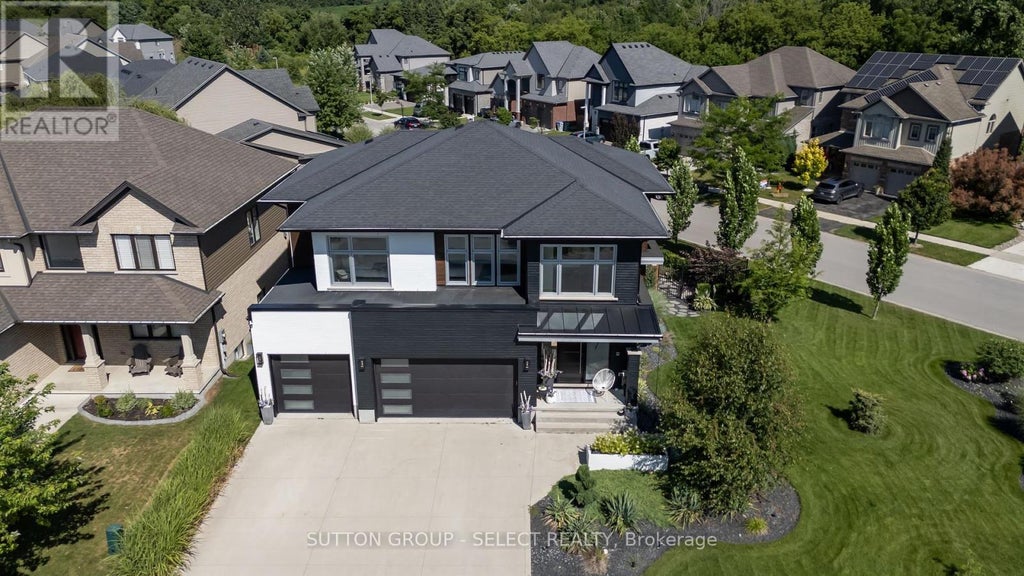 Luxury living redefined 10 min west of London. Tucked onto a quiet crescent, this extraordinary executive residence offers an enviable lifestyle with a premium lot and show-stopping resort-style backyard anchored by a heated saltwater pool with state -of-the-art automated safety cover (~25k), and year-round cabana retreat. Curated with smart home technology, every detail reflects thoughtful design and elevated finish. Modern curb appeal impacts with crisp black-and-white contrast, manicured landscaping, and a triple bay heated garage (fully insulated/epoxy flooring) plus six-car driveway. A dramatic two-storey foyer with glass-railed floating staircase and full-height windows creates a luminous entry. Wide-plank White Oak hardwood draws you to the airy great room and a sleek two-sided gas fireplace with a floor-to-ceiling stone surround that also serves the outdoor living space. The chef's kitchen is striking and high-function, showcasing stone surfaces, a 4-seat island with wine fridge, programmable lighting, and premium stainless appliances. A dedicated home office, sleek powder room, and crisp designer lighting/paint tones elevate the main floor ambiance. Upstairs, the primary suite is a true retreat with a herringbone feature wall, tray ceiling, walk-in closet with custom built-ins, automated shades & a private glass-railed balcony. The spa-like ensuite offers radiant in-floor heat, luxe finishes. Three additional bedrooms each with hardwood flooring, solid-core doors, and motorized shades share the level with a well-appointed laundry room. The fully finished lower level offers an expansive recreation area, full bathroom + a home gym with glass enclosure and high-end audio. Outside, the cabana is an entertainers dream with integrated lighting, wet bar, beverage fridges, and 3-piece bathroom all framed by lush black cedar privacy hedging. A seamless blend of technology & design just minutes from Komoka Provincial Park & 11 km of trails along the Thames River. (id:36535)