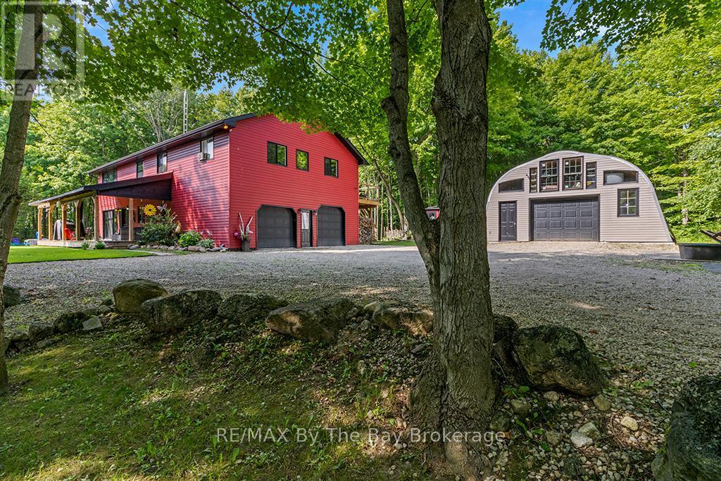 Looking for peace and tranquility, where the only sounds you hear are the birds gentle tweets? Then this home is for you! Through the winding lane leads you to the perfect private oasis with complete privacy 360 degrees. This stunning home was intentionally positioned to soak up the sun rays all day, and catch the sunsets each evening. 11+ acres of premium hardwood trees are not only beautiful, but provide maple syrup, top notch firewood and lumber for your next project. Inside soaring ceilings, an open loft layout and oversized windows bring light and beauty to the space. Stay toasty warm with in-floor heating throughout the main and lower floors. The upper level has 3 good size bedrooms including a primary suite with 4 piece ensuite and a private deck. The finished basement has an additional bedroom, beautiful bathroom and your very own Theatre Room with step up lounge seating and built in speakers. Explore nature and enjoy the land all year round. Walk, ATV or snowmobile through your private trails, or for longer adventures join the expansive conservation trails right off of your driveway. When it's time to relax park your toys and head over to the Forest Retreat with Sauna Haus and Hot Tub to unwind from the day. Plenty of parking and storage is found in the oversized dbl garage with an extended door for trucks and boats. For additional storage, or the possibility to create additional living space, the Quonset Hut is insulated and prepped for in floor radiant heating (960 sqft). Extensive improvements have been completed since 2020 including: All new windows and doors, new water softener, 40 x 12 foot front deck, back deck, all new flooring throughout, 5 new appliances, 2 new bathrooms, new hot tub and many more! Located just 2 hours from the GTA, 25 minutes to Beaver Valley and 35 minutes to Blue Mountain, this home will make the perfect country retreat, or full time home! (id:36535)
