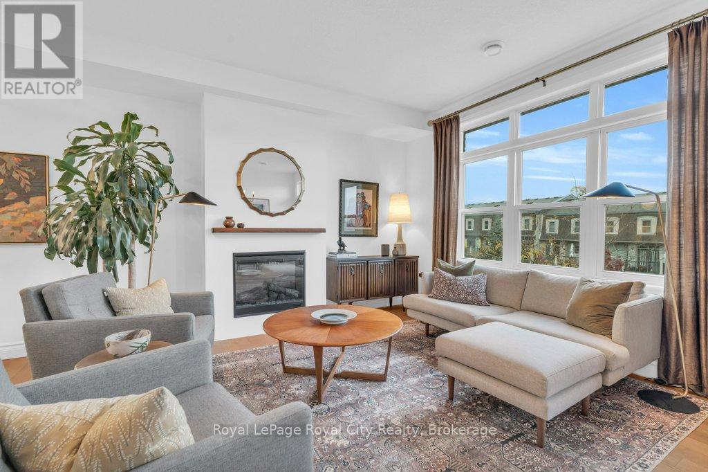 This minimalist mid-century inspired modern home in the highly sought-after Stewart Mill Townes on Cardigan Street is design-magazine ready. Perfectly positioned between Exhibition Park and Downtown Guelph, with Goldie Mill and the Guelph Youth Music Centre just across the street, it is the ideal blend of urban convenience and serenity. This 2,000 sq. ft. end unit with a two-car garage (parking for four) and access to secluded, condo-maintained gardens has been thoughtfully reimagined over the past four years. Every detail has been considered, from smart wall placements that create multi-purpose spaces, to built-in storage that maximizes efficiency. The Hayes Custom Woodworking kitchen features elegant slim-shaker cabinetry, a stunning penny tile backsplash, and clever design that makes it as practical as it is beautiful. The custom-built living room fireplace with a striking teak mantel, creates a warm, cohesive main floor that invites gathering and relaxation. A main-floor office provides the perfect space for remote work, a TV lounge, or a guest bedroom. Upstairs, the second bedroom features three large windows and an updated ensuite. A smart partition creates additional functional space, perfect for a hobby nook, wellness area, or small office. If desired, this space could easily be reconfigured to accommodate a third bedroom. The primary suite is a stunning retreat where, again, beauty meets function. A custom privacy wall defines a flexible space ideal for a dressing room, home office, or cozy reading corner. The five-piece fully updated ensuite features a vintage teak vanity and a timeless design with bold, tile detailing. Storage is abundant throughout, including a loft inside the home and additional storage above the garage for seasonal items. This rare, one-of-a-kind home in Stewart Mill Townes blends intentional design, comfort, and modern living in one of Guelph's most desirable neighbourhoods. (id:36535)