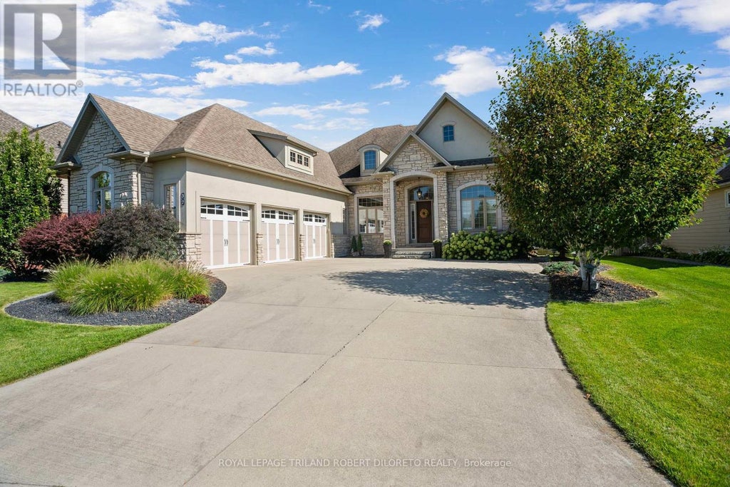 One of the most beautiful homes in Kilworth! Convenience of one floor living + total wow factor throughout this sprawling 3+2 BRM, 3.5 BA custom built (2009) executive w/finished lower, triple garage + extensive list of features & updates all on a large lot in established neighbourhood of custom executive homes on huge lots--no cookie cutter homes here! Features: Grand curb appeal w/multi-car concrete drive, stone & stucco front elevation w/stately covered front entry; stunning open concept main floor layout; elegant neutral decor w/custom millwork & upgraded trim throughout main; gleaming cherry wood floors & tile on main; oversized windows; 'California' shutters; 8ft doors on main; 10 & 12ft ceilings on main + breathtaking living room w/15ft barrel vaulted ceiling, stone fireplace & all highlighted by magnificent window w/remote controlled blinds; beautifully updated kitchen boasts classic white cabinets w/ceiling height uppers, Cambria quartz counters, backsplash, contrasting wood island, quality appliances (refrigerator 2023, dishwasher 2024), coffee bar breakfast area w/remote controlled blinds & access to deck; formal dining room; spacious mudroom (with laundry potential); 3 generously sized bedrooms include luxurious primary bedroom w/5pc ensuite (in-floor heat) + access to covered deck; a 4pc family bath & 2 pc powder room complete the main floor; the finished lower level is accessed by graceful curved staircase & boasts massive family room w/fireplace, games area & wet bar, 2 bedrooms, 4pc bath (in-floor heat), plenty of storage & basement access to garage; the meticulously maintained exterior is serviced by in-ground sprinkler system and the fenced rear yard is simply breathtaking with beautiful landscaping, fabulous covered concrete deck w/BBQ gas line and awesome stamped concrete patio with "HYDROPOOL" hot tub (2022), large garden shed + much more! Steps to park w/tennis courts & playground, Thames River trails + myriad of services in Kilworth/Komoka! (id:36535)
