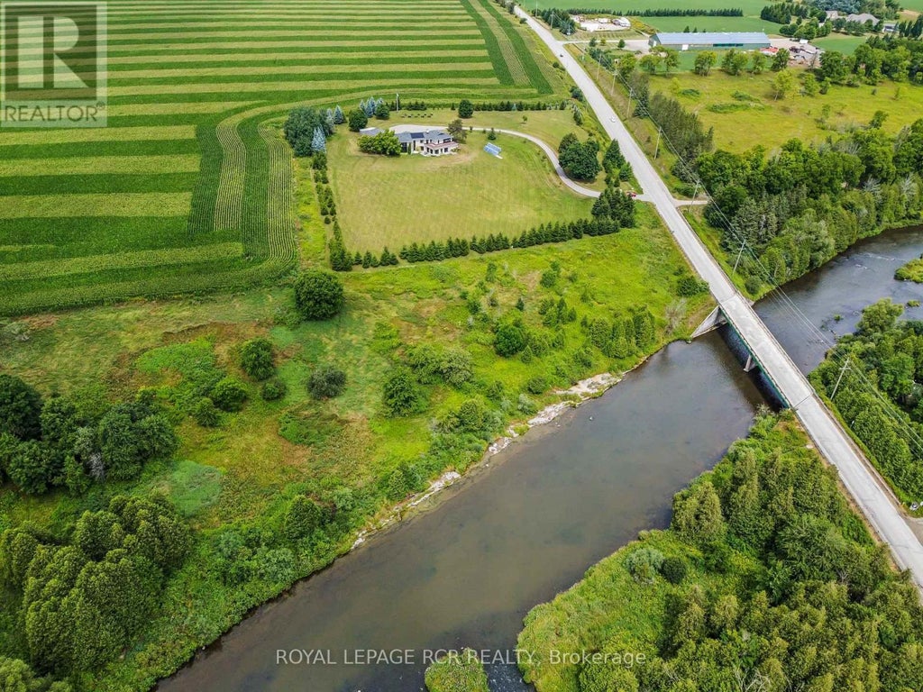 A winding driveway draws you toward The Riverlands, a spectacular top-of-the-line modern estate offering over 7,000 sq ft of total space. Nestled on 3.67 acres with commanding views of the Grand River, this architectural gem was originally built between '67 and '70 and underwent an extraordinary full-scale renovation from '20 to '22. Today, it stands as a seamless fusion of timeless design and forward-thinking sustainability, boasting carbon-neutral, net-zero-ready systems. The main level features a stunning chef-inspired kitchen with quartz countertops, custom cabinetry, and an impressive suite of appliances. Sliding doors lead to a stone patio with a fireplace and BBQ, perfectly positioned to enjoy the sights and sounds of one of Ontario's premier fly fishing destinations. The open-concept living and dining area is enhanced by natural light, bespoke walnut built-ins, and sweeping river views. The primary suite is a private retreat, complete with a five-piece ensuite, custom dressing room with integrated laundry, and access to a versatile den or office with a wood-burning fireplace and access to the rooftop terrace. Two more bedrooms offer walk-in closets and share a beautifully updated bath. A curved staircase leads to the lower level with a second kitchen boasting an indoor charcoal grill, a family room with fireplace, a billiards room, a guest suite, a wine room, and a walk-in fridge, making this a true entertainer's haven with in-law potential. The showstopping indoor saltwater pool has dedicated HVAC and solar-powered heating, plus a sauna, change room, and adjoining sunroom with walkout to the backyard. Rooftop solar panels, geothermal systems, upgraded electrical, smart home features, and plans for a detached 3-car garage complete this one-of-a-kind package. Just minutes from Belwood Lake and downtown Elora, The Riverlands is a rare blend of modern luxury, natural beauty, and sustainable living. (id:36535)